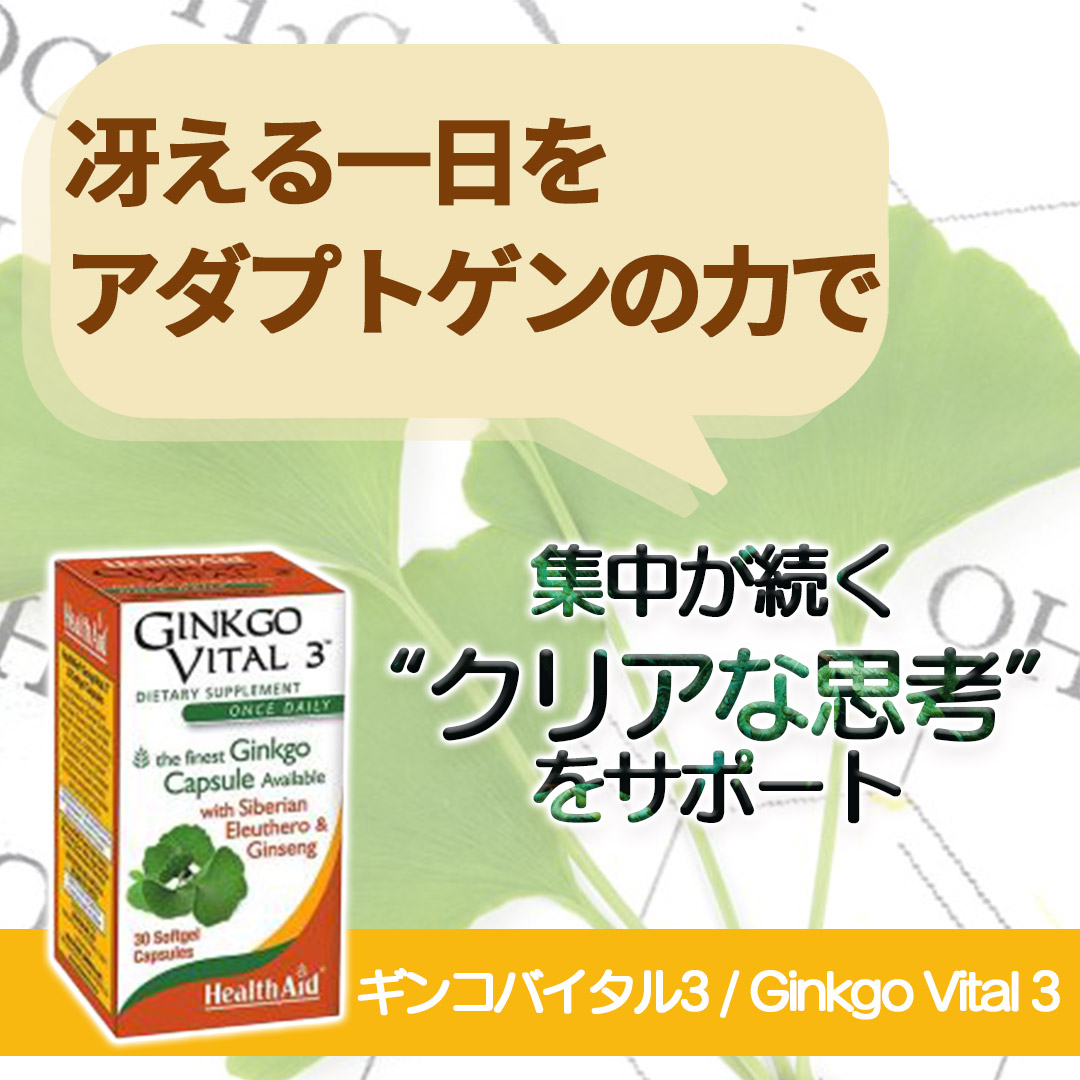 ギンコバイタル3(イチョウ・高麗人参・エゾウコギ アダプトゲンブレンド) 30粒 Ginkgo Vital 3 Health Aid(ヘルスエイド)の商品説明