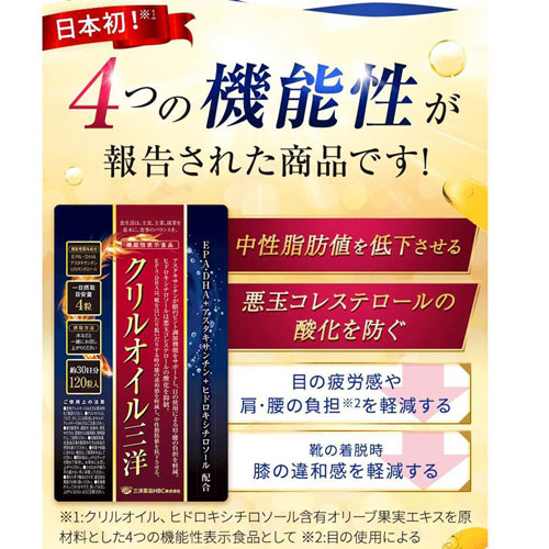 「クリルオイル三洋」は、EPA・DHA、ヒドロキシチロソール、アスタキサンチンの3つの機能性関与成分をまとめて摂れる機能性表示食品です。